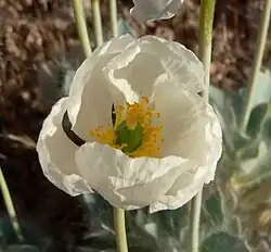 This is a taprooted perennial herb producing stout, waxy stems 20 to 50 centimeters tall. Hairy pale green leaves with rounded teeth are located around the base of the plant. The inflorescence at the tip of each stem is composed of one white poppy flower with six petals up to 4 centimeters long and green sepals covered in long, white hairs. The fruit is a capsule up to 3.5 centimeters long containing many tiny seeds.