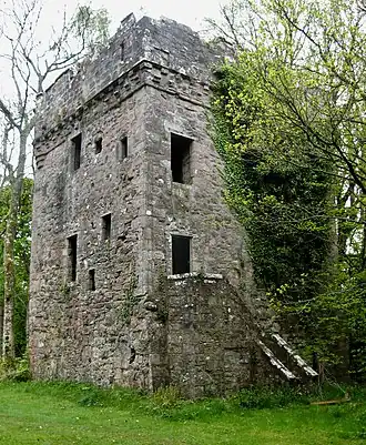 In 1403, King Robert III granted the lands of Ardgowan to his natural son, Sir John Stewart.[2] Ardgowan castle, now an inaccessible ruin, is a tower house built within the site of the earlier castle, and is dated to the late 15th century. It is sited on the south edge of the promontory, perched on a cliff.[8]