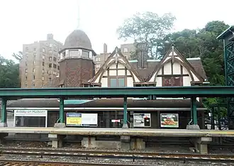 The station was originally part of the Ardsley Casino Clubhouse, a country club created through the support of some of the most notable and successful men in the US including Jay Gould, Cornelius Vanderbilt (New York Central entrepreneur) and John Pierpont Morgan. The Casino was built overlooking the Hudson River and besides the station, had a private dock to accommodate the yachts of members. The Ardsley Racquet and Swim Club, an offshoot established in 1927, inherited the property in 1935, and the casino was closed in 1936.[3] The site was replaced by the Hudson House Apartments. Even with all the changes, the original mid-1890s New York Central Railroad depot remained intact. As with many stations along the Hudson Division, the New York Central merged with the Pennsylvania Railroad in 1968 to form Penn Central Railroad. The 1970 bankruptcy of Penn Central forced it to turn service over to the MTA, which continued through the time it was taken over by Conrail in 1976, and then by Metro-North Railroad in 1983. While there is no official station house, Metro-North does maintain a small two-story brick depot, housing the northbound waiting room, ticket machines, and the United States Post Office for ZIP Code 10503.