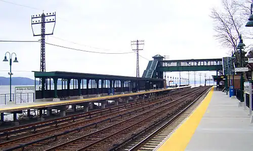 The crossover ramp to southbound or New York City-bound trains was inside the depot until 2006, when Metro-North razed the ramp and built one a few steps to the south, with a higher clearance for projected double-deck trains. At that time new, longer platforms were installed on both sides of the tracks.[4] On February 1, 2010, a sanitation truck smashed into the historic pedestrian bridge leading from the station house to the Hudson House Apartments.[5] The bridge was never rebuilt.