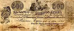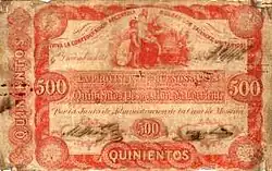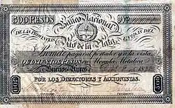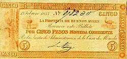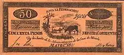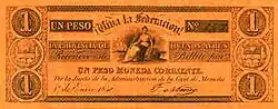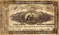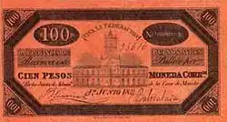 ![]() "Cinco pesos" moneda corriente banknote, issued in 1869 | |