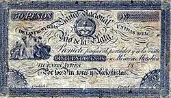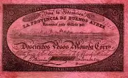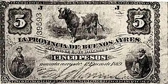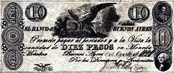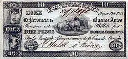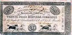 It was also known by the name of the peso papel as opposed to the Peso Fuerte ($F) and the gold or silver coins of previous issues. It circulated almost exclusively in the Buenos Aires Province, since in the interior of the country only metallic coins were used during that time, such as the old Bolivian silver peso, and also, to a lesser extent, coins from other countries. “It was the role of the province of Buenos Aires –or current currency- that really imposed the monetary practices, evicting silver and gold from circulation.”[1]