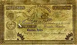 The peso moneda corriente was not the first paper money issued in Argentina as the Banco de Buenos Aires had already issued paper money in 1822, but it was convertible into cash. The inconvertibility decreed in January 1826 was due to the economic problems caused by the War in Brazil. There was an exception: the period from January 3, 1867, to May 17, 1876, in which it was convertible at the rate of $m/c 25 = $F 1 at the Exchange Office of the Banco de la Provincia de Buenos Aires. The return of inconvertibility was due to the exchange rate run caused by the crisis of the 70s. gold first and the strong peso later.