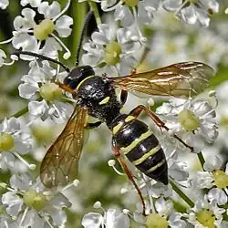 Females of Argogorytes mystaceus usually visit Apiaceae flowers,[5] wood spurge and honeydew on sweet chestnut leaves. Males are known to be pollinator of the flowers of fly orchids (mainly Ophrys insectifera).[3][8] The males of this species try to copulate (pseudocopulation) with these specialized flowers, that mimic (pouyannian mimicry) the shape and the scent of the females, with the purpose of deceiving them and thereby pollinate the flowers.[9][10][11]
