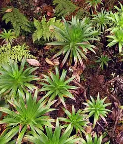 The silversword alliance provides a convincing natural case study in evolution by adaptive radiation, with the greensword representing one extreme of the genus' plasticity.[4] Some Argyroxiphium, including the well-known Haleakala and Mauna Kea silverswords, live in harsh alpine desert-like conditions of heat, sun, wind, and aridity, and are drought-adapted plants capable of storing water as a gel in leaf structures which are normally air pockets in other plants.[5] However, A. grayanum is a bog plant adapted to very different conditions – excessive moisture, lack of regular sunlight, and cool temperatures, and its leaves are non-succulent like those of the related genus Dubautia.[6]