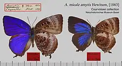 The wingspan of Arhopala micale is approximately 40 mm. The upper surface of the wings is very similar to that of A.sophrosyne, but overall it appears somewhat more ultramarine, particularly in the costal area of the forewing, which exhibits a more violetish-blue hue. The under surface lacks the intense brightening in the distal part of all the wings; the spots are larger, more irregular, and in the hindwing.— superba Rob. is beneath in both sexes browner, in the female above the black margin of the wings is broader and more sharply defined[2]