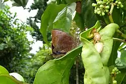 The larvae feed on Buchanania arborescens, Cordia dichotoma, Calophyllum inophyllum, Terminalia muelleri, Glochidion ferdinandi, Cryptocarya hypospodia, Lagerstroemia speciosa, Hibiscus tiliaceus, Acmena, Cupaniopsis anacardioides, Heritiera littoralis and Oxera splendida. They are attended by the ant species Oecophylla smaragdina.