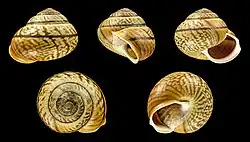 The shell is usually brown with numerous pale yellowish rows of spots and usually with a brown band above the periphery, occasionally yellowish, reddish or with greenish hue, weakly striated and with fine spiral lines on the upper side.[4] The shell has 5-5.5 convex whorls with deep suture.[4] The last whorl is slightly descending near the aperture.[4] The aperture is with prominent white lip inside.[4] The apertural margin is reflected.[4] Umbilicus is entirely covered by the reflected columellar margin.[4]