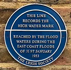 A blue plaque marking the level of the flood water was installed by the Leigh Society on the wall of the Heritage Centre in Leigh-on-Sea to commemorate the flooding there.[37]