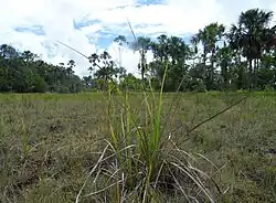 The savannas are home to many rare plants, including at least two endemic species: Rhynchospora aripoensis and Xyris grisebachii. They also provides a habitat for several rare and threatened animals. In the past, the area has been exposed to considerable disturbance due to human activity, but the savannas along with the associated Marsh and Palm forests are now protected within the 1,788 hectare Aripo Savannas Environmentally Sensitive Area.[3][4]