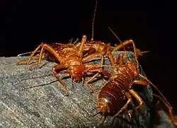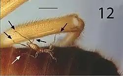 Like some other earwig species[6] Arixenia esau is viviparous, giving birth to live offspring that develop in a uterus.[7] This feature has evolved twice within the Dermapteran order, in the groups Hemimeridae and Arixeniidae. Arixenia esau has a unique respiratory system to support larval development within the reproductive tract of the mother. An extensive tracheal system within the mother's body delivers oxygen through the respiratory pigment hemocyanin which is found in the fatty tissue of the larva while a placenta-like organ growing out of the larval abdomen mediates this gas exchange.[8]