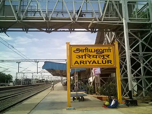 Ariyalur railway station is a major railway station on chord line connecting Chennai and Tiruchirappalli. Several daily trains such as Pallavan Express, Rockfort Express, Pearl City Express, Vaigai Express, Guruvayur Express, Tambaram–Mangaluru Central Express, sethu expressetc. connect Ariyalur with Chennai Egmore and Tiruchirappalli Junction.