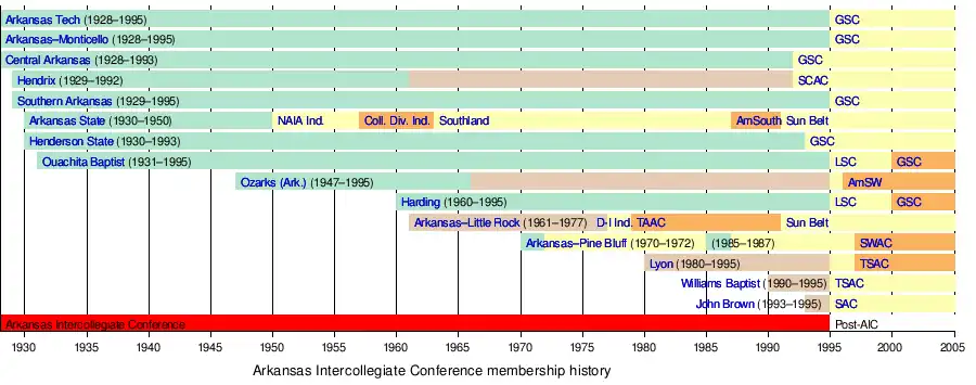 - ^ a b Arkansas–Pine Bluff appears to have been a member of the AIC from 1970–71 to 1971–72; and then again from 1985–86 to 1986–87.