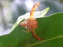 Arkys, also known as triangular spider or ambush spider,[7] is a genus of Australian araneomorph spiders in the family Arkyidae, first described by Charles Athanase Walckenaer in 1837.[8] They are often small, with a triangular shaped abdomen, and are found in Australia and some of its surrounding islands. They don't build webs, but can often be found on leaves and tips of flower heads. Their egg sacs are pinkish-orange and spherical, and are made late in the summer.[7]