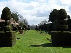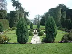 The formal gardens cover an area of 12 acres (4.9 ha).[30] The visitor approaches the hall and gardens along an avenue of pleached lime trees which are clipped each year. The main path passes under the Clock Tower (see below) and a path on the right leads into the Flag Garden, so-called because its paths are formed from flagstones. This leads to the Furlong Drive, a straight path leading in a southwesterly direction from the house to the Sundial Circle, which is exactly a furlong (220 yd or ~200 m) in length. Parkland lies on the southeast side of the path, and this is separated from the formal gardens by the ha-ha. To the north of this path is the double Herbaceous Border, which was the first of its type in England. It consists of four pairs of flowerbeds which are backed on one side by a 19th-century wall and on the other by a yew hedge. Between the sections of the border are yews which have been pruned into decorative shapes. To the south of the herbaceous border is the Ilex Avenue which consists of seven pairs of holm oaks clipped into the shape of cylinders 8 metres (26 ft) high and 3 metres (9.8 ft) in diameter. In the angle between the Herbaceous Border and the Ilex Avenue is the Shrub Rose Garden.[31][32]