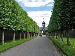 The main entrance to the grounds is through an arch over which is the 19th-century Clock Tower. The clock it contains has only one hand. Extending from the south of the Clock Tower is a building now known as The Ride. This was originally a barn built in 1471 and converted into an indoor riding school in the 19th century.[31] It is a timber framed building with brick infill on a stone plinth with a slate roof. Internally there are seven cruck trusses. This building is listed Grade I.[35] A Grade I building is one which is "of exceptional interest, sometimes considered to be internationally important."[36] In the other direction, extending to the north of the Clock Tower is another barn, this one dating from about 1602. It is built in brick with stone dressings and has a slate roof. It is now used as a tea shop and kitchen, and is listed Grade II.[37] A Grade II building is "nationally important and of special interest".[36] The forecourt walls and gate piers at the south front of the hall, and the balustrade to the east of the hall are listed Grade II.[38][39] Both the Walled Garden and the Kitchen Garden are listed Grade II.[40][41] At the western end of the Herbaceous Border is a structure known as The Alcove which was built about 1790.[31] This is a garden seat enclosed in a decorated surround built in brick, rendered brick and stone. It is listed Grade II.[42]