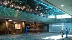 Also inside the Sports Center are fitness and leisure facilities. These include a bowling alley, an ice skating rink, rock climbing walls, a mini-golf course, a water park, a sun deck, an inline skating track, and two snack bars.[7][10][11]