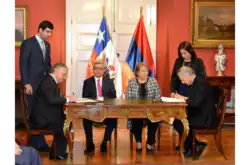 In 2007, the Chilean government recognized the Armenian genocide.[4] In 2010, Armenia appointed an honorary consul in Santiago.[3] In July 2014, Armenian President Serzh Sargsyan paid an official visit to Chile.[4] During the visit, President Sargsyan met with Chilean President Michelle Bachelet and both leaders discussed a wide range of issues with regard to strengthening the Armenian-Chilean bilateral relations and making joint efforts at promoting cooperation in a number of promising areas. Both leaders signed a Memorandum of Mutual Understanding on Cooperation between both nations Ministry's of Foreign Affairs.[4] In 2016, Chile appointed a resident honorary consul in Yerevan.[3]