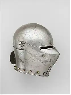 The classic armet had a narrow extension to the back of the skull reaching down to the nape of the neck, and the cheekpieces were hinged, horizontally, directly from the main part of the skull. From about 1515, the Germans produced a variant armet where the downward extension of the skull was made much wider, reaching as far forward as the ears. The cheekpieces on this type of helmet opened sideways, on vertical hinges on the edges of this wider neck element.[5] The high-quality English Greenwich armours often included this type of armet from c. 1525. Greenwich-made armets adopted the elegant two-piece visor found on contemporary close helmets; armets of this form were manufactured until as late as 1615. The lower edge of such helmets often closed over a flange in the upper edge of a gorget-piece. The helmet could then rotate without allowing a gap in the armour that a weapon point could enter.[6]