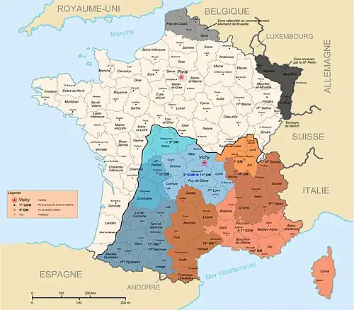 The 1st Group of Military Divisions was formed in September 1940. Its headquarters was at Avignon. The corps was disbanded in 1942 when Operation Anton was launched and Vichy France was diminished. The 1st Military Corps had overall control of the divisions that were in South France and Southeast France. It notably participated in Operation Dragoon (alongside the German Army). Although the corps itself never saw full combat units part of it saw action in both Operation Torch in North Africa and The Syria–Lebanon Campaign.[8]