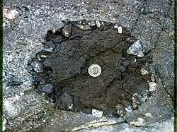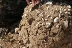 An armored mud ball is a small sedimentary structure, formed in flowing water, which consists of a fragment of clay or mud that has been rolled by currents into a spherical shape, and which then becomes coated in a layer of sand, gravel or pebbles that serves to protect (armor) it against further breakdown.[1][2] Armored mud balls can vary in size from less than a centimeters up to 50 centimeters in diameter. Typically, they are between 5 and 10 centimeters in diameter.[1] Mud balls are known to form in many parts of the world,[3] and armored mud balls can form in river, lake or marine environments.[4][2]