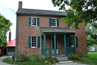 Built of brick, the farmhouse rests on a stone foundation, is topped by an asphalt roof, and features additional elements of wood and asphalt.[1] The basic plan is a simple two-story rectangle, wider than its length, with windowless ends that rise to chimney-topped gables. An extension, most of the width of the house, is attached to the rear, while a porch occupies the ell. Three windows pierce the second story on the facade, while the main entrance sits at the center of the first story between one window on either side. A small porch with a shed roof shelters the entrance.[3] Besides the farmhouse, the complex includes a cemetery and six outbuildings,[1] including the original log cabin and a bank barn.[2]