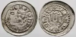 ![]() Silver denier of Arnold I of Vaucourt, Archbishop of Trier. Obverse shows the mitered archbishop with a crosier and the name ARNOD.; the reverse shows an arched structure with five towers and a cross, with the motto TREVERORUM. | |