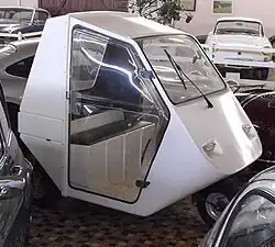 Model 18 was introduced in 1981. It is somewhat larger and has an even more squarish shape than its predecessors. Above all, it is built on an innovative concept with an aluminum-reinforced polyester floor, and a body constructed of an aluminum structure that carries the polyester body panels. There were four engines to choose: Three 50 cc by BCB, Motobécane or Peugeot, and a 125 cc BCB which gave the vehicle a top speed of 40 mph (ca. 65 km/h). The Model 18S was a little bit more sophisticated and had amenities like a clock. Model 18 was 78.47 in. (2000 mm) long, had a width of 49.21 in (1,250 mm) and weighed in at 418.88 pounds (190 kg). All were designed mainly for ease of operation, comfort, and safety, and not to be stylish.[1] The transmission was simplicity itself - a stick, pushed forward for forward motion and pulled backwards for reverse.[1]
