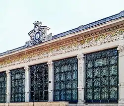 At the beginning of the 20th century the Milanese bourgeois class, formed as a result of industrialization and already becoming masters of the social and economic life of the city,[2] found in the new liberty style a "symbol of status" and the occasion to show its power and at the same time underline the clear departure from the noble class and its neoclassical and baroque residences.[3] The Milan International world's fair of 1906 gave further impetus to the development of liberty, as dozens of pavilions and numerous public buildings were built in this style, which decreed the definitive consecration of liberty as the dominant artistic style in the city.[4] Reaching its peak in 1906, Milanese liberty experienced the first contaminations with eclectic architecture, which became stronger and stronger until the years of World War I, after which the liberty survived only with minor influences on minor architecture, while the taste of the industrial bourgeoisie converged spontaneously towards art deco.[5][6] The Milan Central Station, built from 1924 in a late-eclectic style with Art Deco decorations and modernist influences, is considered by Gualdoni and Melano the conclusion of art nouveau in Milan, which made room for art deco and Italian Novecento.[7][8]