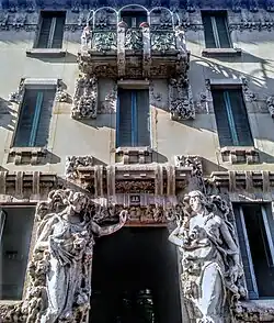 The Milanese stage of the liberty style was inaugurated with the construction of the Palazzo Castiglioni, completed in 1903 according to the project of Giuseppe Sommaruga, who would become, according to Sacerdoti, the most prominent interpreter of Milanese art nouveau.[9] The building, decorated with cement sculptures of floral theme and wrought iron compositions typical of the new style, distances itself from art nouveau by its monumental forms and the use of classical elements such as the putti, taken from the nearby noble palaces, where the neoclassical style dominates.[17] The palace, considered by Lopez, Susani and Roiter one of the best examples of Italian art nouveau and built in one of the most elegant streets of Milan, remarked even more clearly the status of the new bourgeois class and introduced with force in the city the use of cement as a sculptural element.[18][19] The "breaking signal" thrown to the old ruling class was even more intense due to the presence on both sides of the entrance of two statues representing two naked women in very daring poses, which caused a great scandal, to the point that the palace was colloquially renamed by the Milanese la ca' di ciapp (the "house of the buttocks") in reference to the subsequent nudity of the two women and the architect was forced to remove them and move them to the then peripheral Villa Faccanoni, another example of a liberty, suburban villa also designed by Sommaruga, in which the putti sculptures and the motif of the windows divided by columns on the top floor of Palazzo Castiglioni were reproduced.[20]