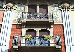 According to Sacerdoti, another leading interpreter of Milanese art nouveau was Giovanni Battista Bossi, who has in the Casa Galimberti his most famous work.[9] The facade of this building presents a complex decoration with ceramic tiles painted with human forms and plant elements that show elaborate chromatic contrasts. Also noteworthy are the decorated balconies made of cement and the wrought iron a baldaquino balconies.[21] A few meters away is the Casa Guazzoni, also by Bossi, which despite retaining the typically floral style of the facade presents a decoration completely centered on sculpture with elaborate putti devices, female figures and plant forms also in cement and wrought iron with overlapping balconies.[22] Bossi lastly designed the Casa Alessio, more akin to the Viennese Secession style with its rigid geometries and the vertical strip in correspondence with the entrance.[23]
