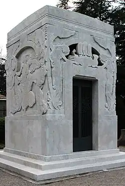 According to Casero, one of the most remarkable monuments in the cemetery is the Edicola Toscanini, made in Carrara marble by Leonardo Bistolfi. It consists of a simple parallelepiped-shaped monument with bas-reliefs representing allegorical figures of the life of the deceased, together with lines inspired by the German jugendstil, whose orderly and geometric composition manages to conjugate with the curved lines and sinuosity of a more floral liberty.[49] Among the examples of floral liberty is the Edicola Giudici designed by Paolo Mezzanotte, whose decoration, realized by the brothers Carlo and Luigi Rigola, consists of cast bronze modeled in the shape of roses and withered branches: the floral theme of liberty is thus adapted to the funeral theme. The monument is completed by a mosaic, also with a floral theme.[50]