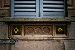 It was on this occasion that the Primo quartiere popolare della Società Umanitaria was built on Via Solari according to the project of the architect Giovanni Broglio. It is one of the first examples of social architecture in the city, as well as one of the first applications of art nouveau in popular architecture. The project envisaged eleven four-story buildings with a total of two hundred and forty residential units equipped with private bathrooms with drinking water, intended to accommodate a total of about a thousand people. The maximum rent for the larger apartments was one hundred liras per month (just under three hundred and fifty euros updated to 2006).[39] Logically, the project could not feature the elaborate and expensive decorations of the bourgeois liberty houses, therefore Broglio adopted industrially mass-produced decorative elements. The term liberty minore is sometimes used to define this style which, despite having a much smaller budget, nevertheless allowed a diffuse and homogeneous architectural decoration, although not very elaborate.[13]