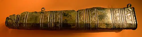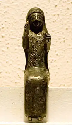 The bronze statuettes were cast separately and then attached to the cauldron. They include bull heads and winged deities, possibly the god Shivini and his wife Tushpuea.[3] The technique of casting bronze ornaments spread from Urartu to the neighboring countries, in particular to Phrygia, and then to Europe. Urartian cauldron ornaments have been found in Rhodes, Athens, Boeotia, Delphi, Olympia and in Etruscan tombs.[6][7][8] Some Urartian bronze figures were removed from the boilers and re-used by other nations to decorate new vessels.