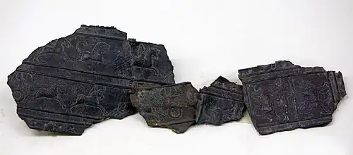 Contrary to expectations, very few stone reliefs and sculptures were found during excavations,[17] although the reliefs of the Assyrian king Sargon II depicting the Urartian city of Musasir clearly show large statues.[1] Only a few minor remnants of stone reliefs were discovered in Turkey: the rest were likely destroyed after the fall of Urartu. However, pottery items were found in large numbers.[18]