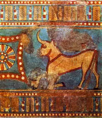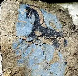 Colored frescoes in rather good condition were found in the ruins of the Urartian fortress of Erebuni.[19] Unlike many other Urartian cities, Erebuni was not burnt but left without a fight and then abandoned; this helped preserve its murals.[20][21]