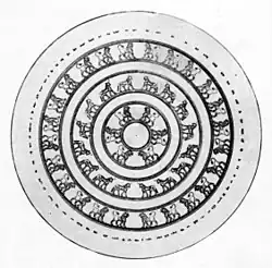 Jewelry of Urartu had two gradations: ornaments made of precious metals and stones for the king and his family, and their simplified bronze versions used by the rich. Many jewelry items were also used as amulets.[16] Annals of the Assyrian king Sargon II mention vast amounts of Urartian jewelry items made of silver and gold which were taken from Musasir in 714 BC.[1] They are not preserved and some may have been melted by treasure hunters.[3] The two largest recovered jewelry items are shown below. They are the pectoral decoration excavated at the late Urartian capital Rusahinili and the cover of the cauldron found at Teishebaini. Smaller items include golden pins, earrings, a bracelet and a few medallions. Jewelry was worn in Urartu by both men and women. Women's jewelry usually portrayed the Urartian goddess Arubani, wife of Ḫaldi – the supreme god of Urartu. Also common are Mesopotamian motifs such as tree of life and winged sun. More accessible jewelry included bronze bracelets and earrings and carnelian beads.[16]