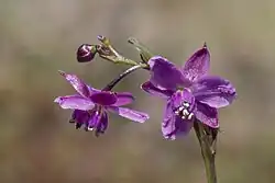 Arthropodium minus, the small vanilla lily, is a species of herbaceous perennial plants native to the Southern Hemisphere. Valued as bush tucker as the roots are edible raw. Found in a variety of habitats from the coast to alpine areas of eastern Australia. Eucalyptus forests, woodlands and sub-alpine meadows, favouring drier habitats than Arthropodium milleflorum.
