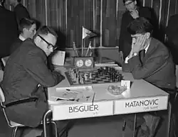 Following his U.S. title in 1954, Bisguier regularly returned to compete for the national championship, but was never able to repeat his success. The late 1950s saw the sensational rise of Bobby Fischer, who swept the eight U.S. Championship tournaments that he contested. Bisguier and Fischer were tied for first place going into the last round of the 1962–1963 event, and they still had to face each other. Bisguier had a promising position but made a mistake, which Fischer punished spectacularly, allowing Fischer to take the game and the title.[4] Fischer scored 8/11, with Bisguier a point back in clear second place.[5] Bisguier also served as a second to Fischer at several international events.