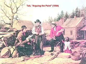 Americans arguing politics in 1854 while ignoring the farm chores.