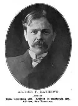 Arthur F. Mathews (October 1, 1860 – February 19, 1945) was an American Tonalist painter who was one of the founders of the American Arts and Crafts Movement. Trained as an architect and artist, he and his wife Lucia Kleinhans Mathews had a significant effect on the evolution of Californian art in the late 19th and early 20th centuries. His students include Granville Redmond, Xavier Martinez, Armin Hansen, Percy Gray, Gottardo Piazzoni, Ralph Stackpole, Mary Colter, Maynard Dixon, Rinaldo Cuneo and Francis McComas.[1][2][3][4][5]