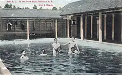 In 1913, after returning to Britain for a few months to recover from a fall from a horse, Wohlmann met Dr. Sigmund Saubermann from Berlin, who explained the therapeutic benefits of radioactive mineral water.[61] He convinced the government that the public was "radium-mad"[62] and secured the purchase of an "activator" from a specialist firm in London to enrich mineral water with radium emanation, or radon, to be administered orally in doses of four to six glasses a day,[63] drunk at "frequent intervals" to "maintain the charge in the blood".[64] Increased urine production, gut excretory activity and sexual activity are among the expected beneficial effects.[65] According to Rebecca Priestley and John Horrocks, this therapy was not the result of charlatanism, but of a desire to offer "the best technology available" at a time when the harmfulness of radium was still unknown.[66][67] Moreover, Wohlmann adopted a holistic approach to spa treatment,[68] considering ambience, change of atmosphere and climate to be an integral part of it; this approach went hand in hand with a more commercial argument, highlighting the age-old expertise of the Maoris from which spa-goers could benefit.[69]