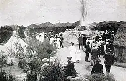 In 1906, Wohlmann was entrusted with organizing part of the Tourism Department's section at the Christchurch International Exhibition. Responding to visitors' expectations of spectacular attractions at the time,[49] Wohlmann designed and built a "wonderfully accurate copy of some of the most remarkable features of the thermal regions [... where,] after passing through a portal surrounded by carved Maori totem poles, the visitor is immediately transported to the land of soufrières, wai-arikis [hot springs], geysers and fumaroles".[50] This ingenious and faithful miniature recreation of "geyserland" was inaugurated by the Prime Minister, Joseph Ward, and earned Wohlmann his congratulations.[50][51]
