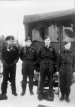 Promoted to squadron leader, Umbers was given command of his former unit, No. 486 Squadron, on 11 December.[5] At the time, it was part of the Second Tactical Air Force, flying from the Volkel airfield in Holland.[22] On 1 January 1945, the Luftwaffe launched Operation Bodenplatte, a coordinated strike against the Allied airfields in the Low Countries. Umbers, in the air at the time and leading a reconnaissance flight, intercepted and destroyed a Fw 190 and a Messerschmitt Bf 109 fighter near Helmond.[1][23] He was subject to friendly fire on 13 January when, while supporting the United States 1st Army in the St. Vith area, his Tempest was damaged by American anti-aircraft fire. He crashed behind Allied lines and had a heated argument with American troops over the incident.[24] Ten days later, near Rheine airfield in Germany, he shot down a Bf 109.[1]