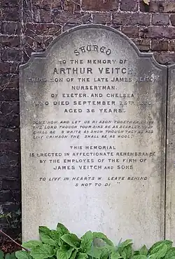 He is recorded in the 1871 census as living at 5 Oakfield Street, Chelsea with his wife, Emily. The house had been constructed in the 1860s and the plans were drawn by the architect, George Godwin.[1] His memorial stone in Brompton Cemetery, close to where he lived and died in Edith Grove,[2] states: "This memorial is erected in affectionate remembrance by the employees of the firm of James Veitch & Sons." (see photograph). The death records from the Brompton Registers on Find My Past show that his wife arranged for him to removed from Brompton at a later date.