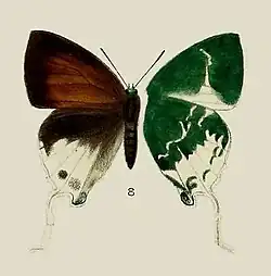 1. ^ Druce, H. H., 1896. Description of a new species of Bornean Lycaenidae. Ent. mon. Mag. 32: 78–79.