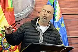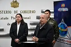 Soon after being sworn in, Murillo announced the "hunt" for the "seditious", stating that "this is not going to be a ministry of persecution […]. But whoever tries to be seditious from tomorrow, take care".[22] In particular, he singled out Juan Ramón Quintana, ex-minister of the Morales government, whom he called "an animal that is killing people in our country".[23] He ended his comments by warning that Quintana and other dissidents should "begin to run because [he is] going to catch them".[24] On 25 November, the Prosecutor's Office issued an arrest warrant against Quintana on charges of sedition and terrorism, with further notices being issued for the ex-minister of cultures Wilma Alanoca.[25]