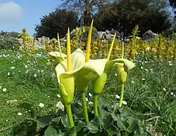 Arum creticum, the Cretan arum, is a species in of flowering plant in the family Araceae.[1][2] It is native to the Greek island of Crete (Kriti), the Eastern Aegean Islands, and southwestern Turkey. This semi-evergreen clump-forming tuberous perennial has large arrow-shaped leaves. Erect folded-back spathes of fragrant yellow or cream appear in spring, with longer narrow spadices of a darker yellow. The flowers are followed in autumn by clusters of red or orange fruit.[3] The plant reaches 50 cm (20 in) tall and broad.