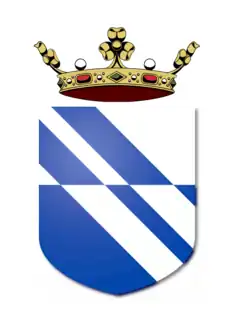The coat of arms of the family used since at least the 17th century are Party per fess argent and azure, two bends counterchanged, with the coronet of a Venetian Patrician.[8]
