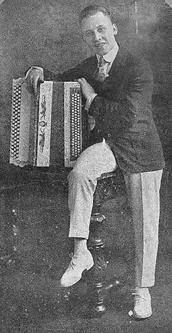 In 1929 Franzen played on six Hjalmar Peterson recordings and on six Hjalmar Peterson Orchestra recordings.[3] The same year he was a guest artist with Peterson's traveling company of singers, dancers and musicians on a tour of the Upper Midwest. The newspaper in Bagley, Minnesota wrote of an upcoming visit by "Arvid Franzen, the celebrated accordion artist, whose Victor and Columbia records are found in tens of thousands of Scandinavian homes."[5]